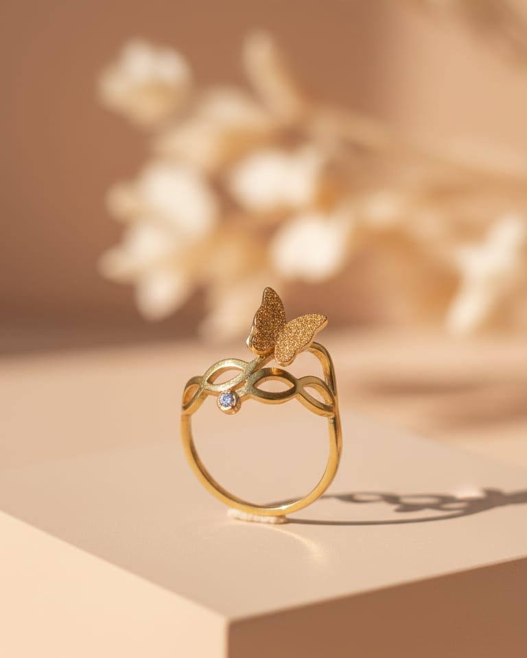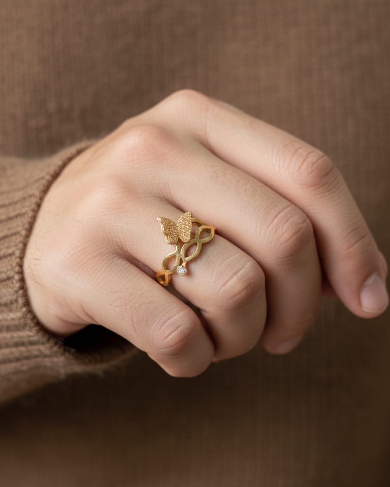 Golden butterfly ring with intricate band and a small gemstone.