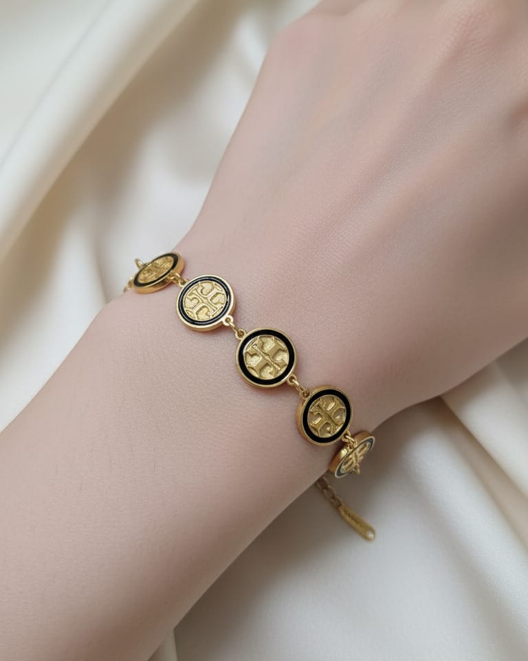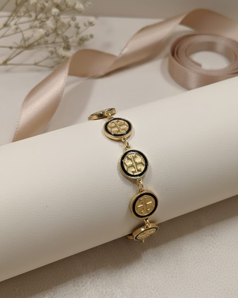 This elegant bracelet features a series of circular, gold-toned links, each adorned with a distinct emblem set against a dark enamel background, connected by delicate gold rings.