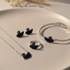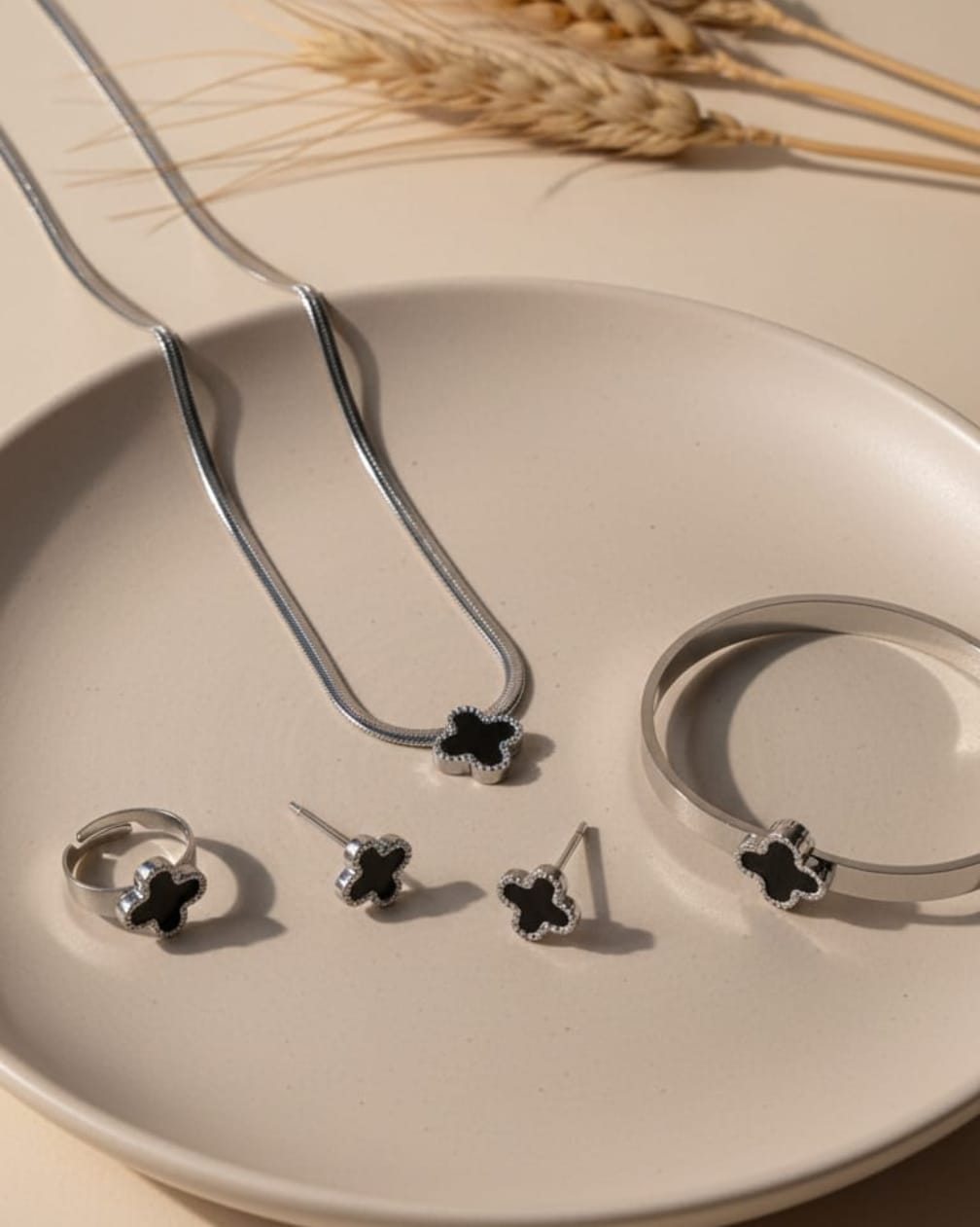 Modern silver-plated jewelry set featuring black clover designs, including earrings, a necklace, a ring, and a bangle, elegantly displayed on a neutral plate with natural wheat stalks.