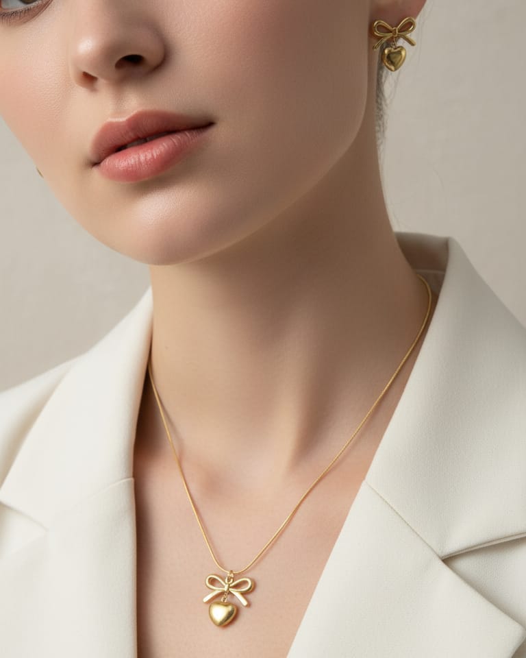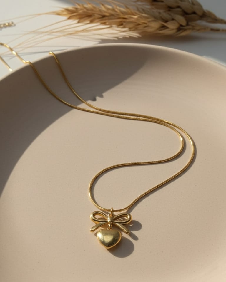 A charming gold necklace featuring a sleek chain and a pendant that combines a delicate bow with a puffed heart.