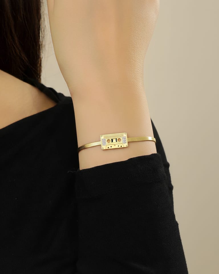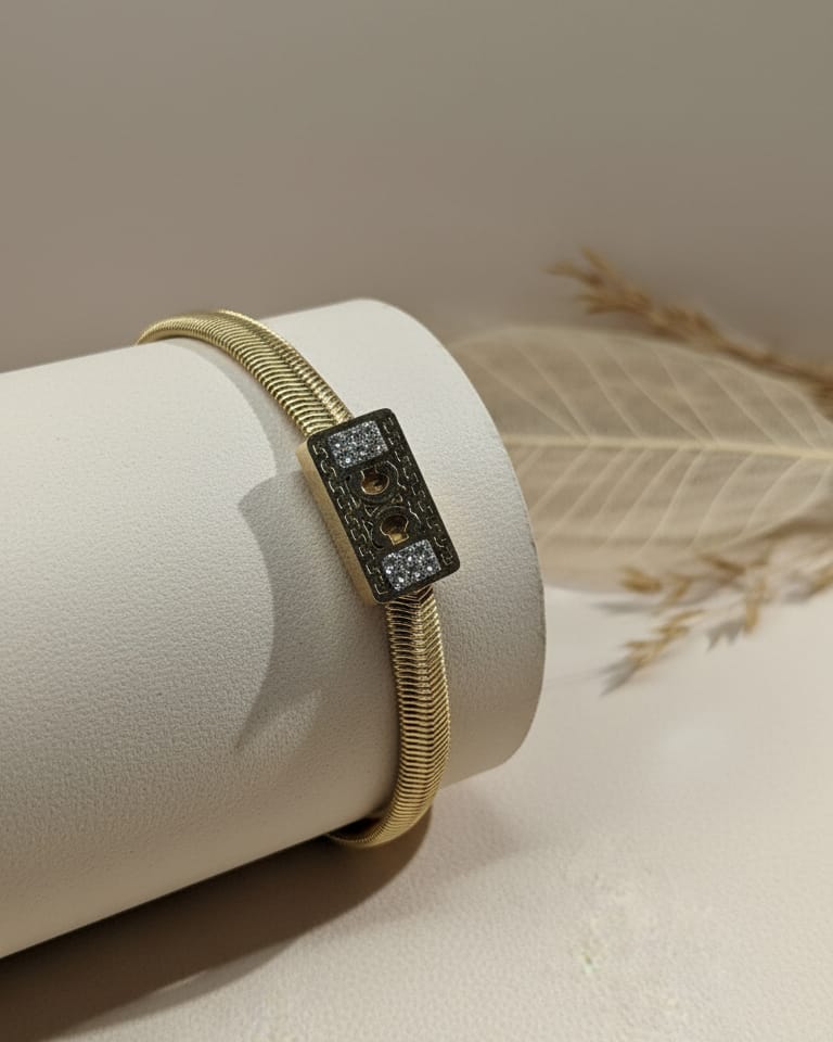 Elegant gold bracelet featuring a textured snake chain and a rectangular clasp adorned with intricate detailing and subtle sparkle.