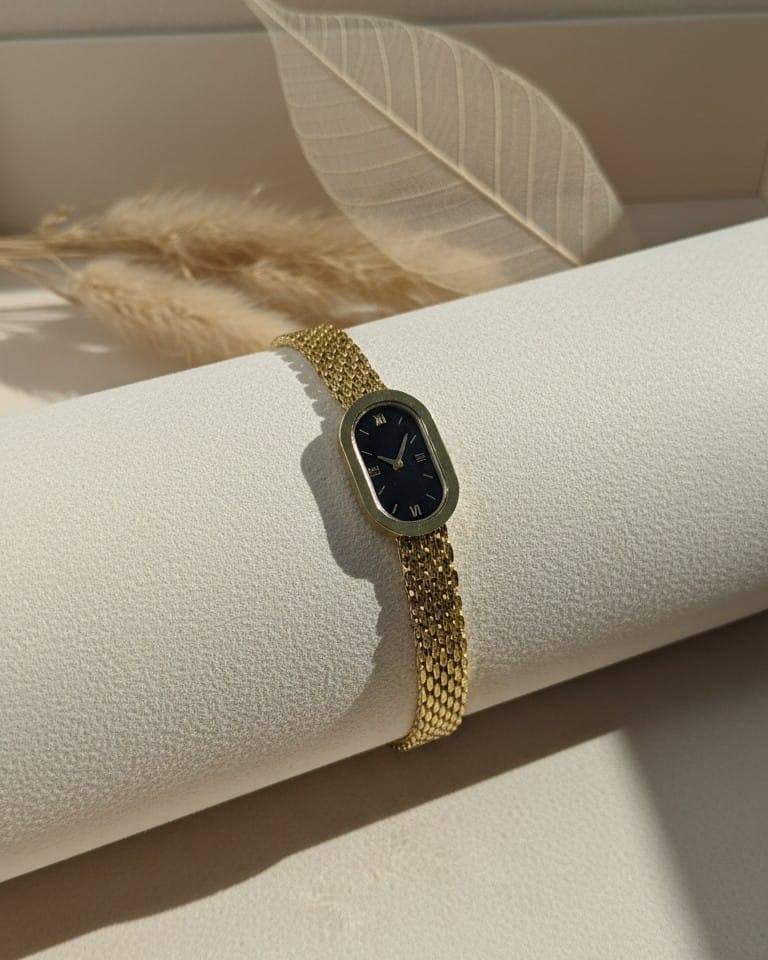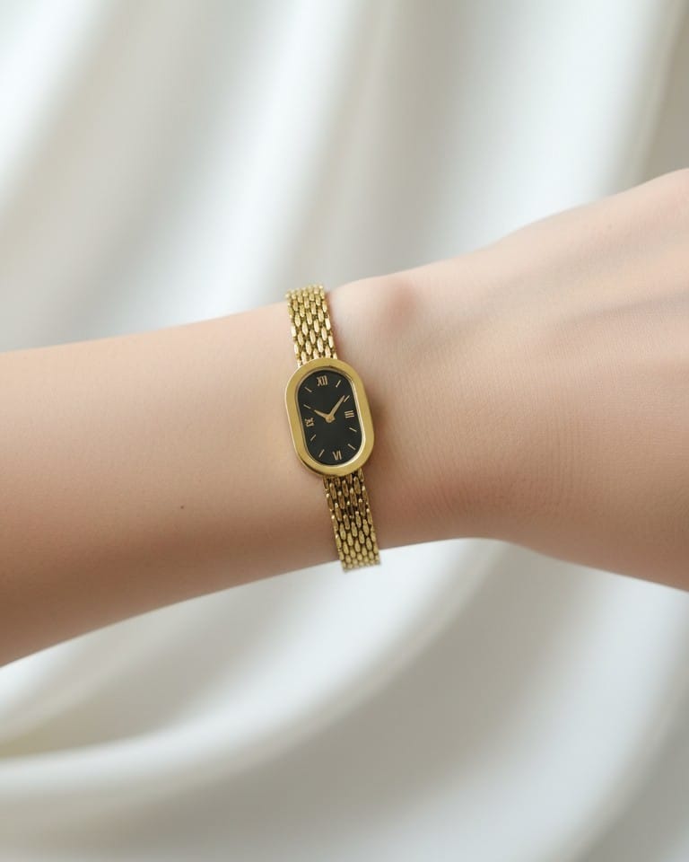 Chic gold watch breclet with a sleek black rectangular dial and a sophisticated mesh strap, embodying timeless elegance.