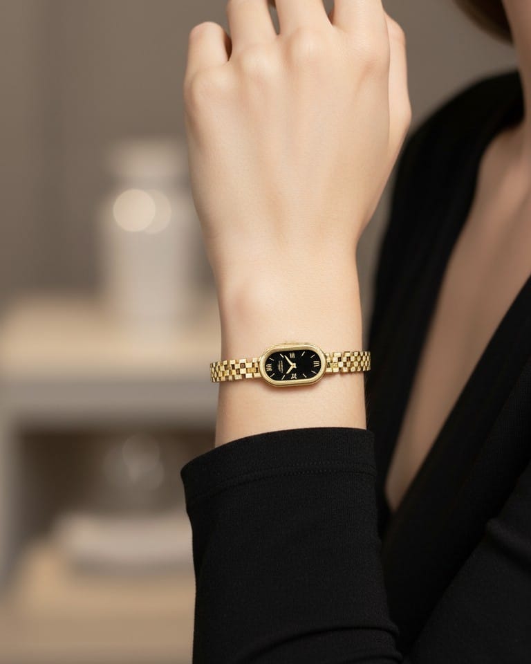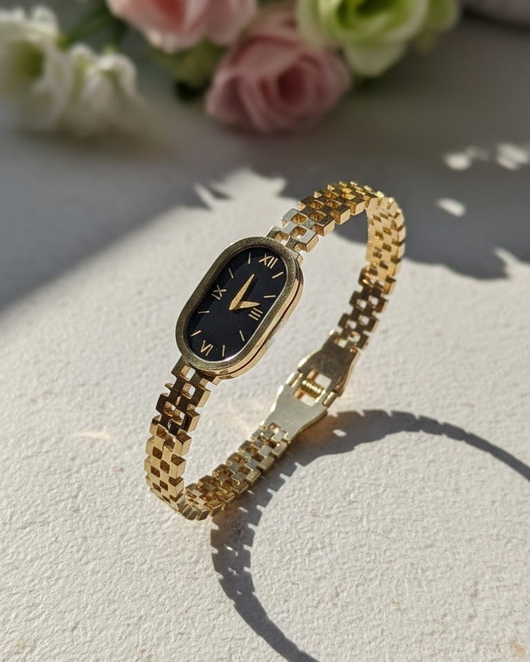 This image features a stylish gold oval watch with a black face and Roman numerals, resting on a textured white surface. In the blurred background, soft pink and white roses add a delicate touch.