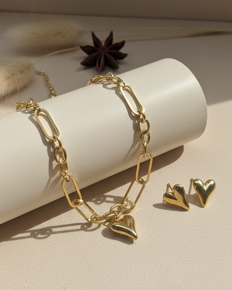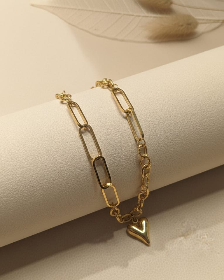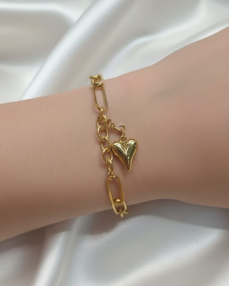 Elegant gold bracelet with a charming heart pendant, perfect for adding a touch of romance to any outfit.