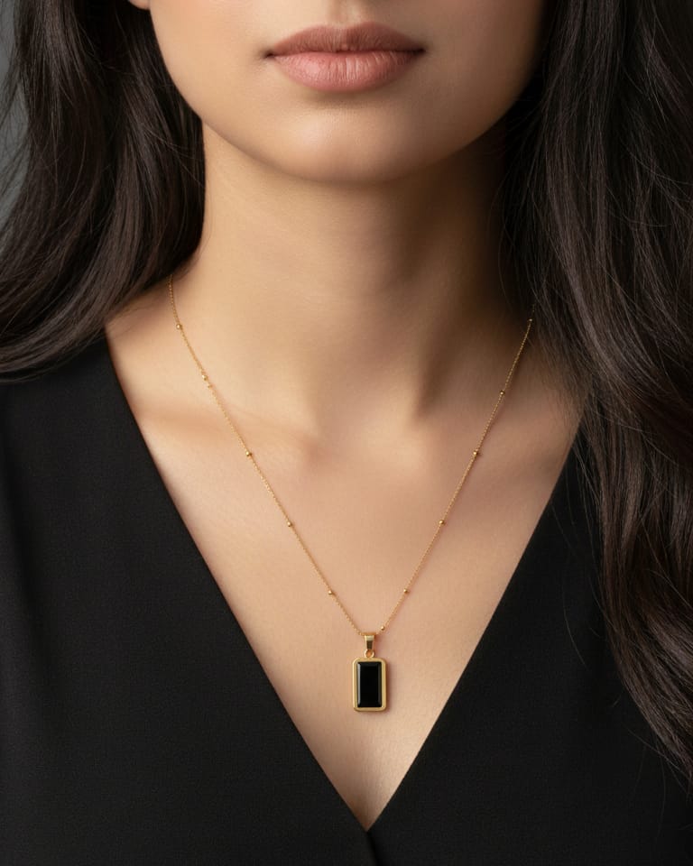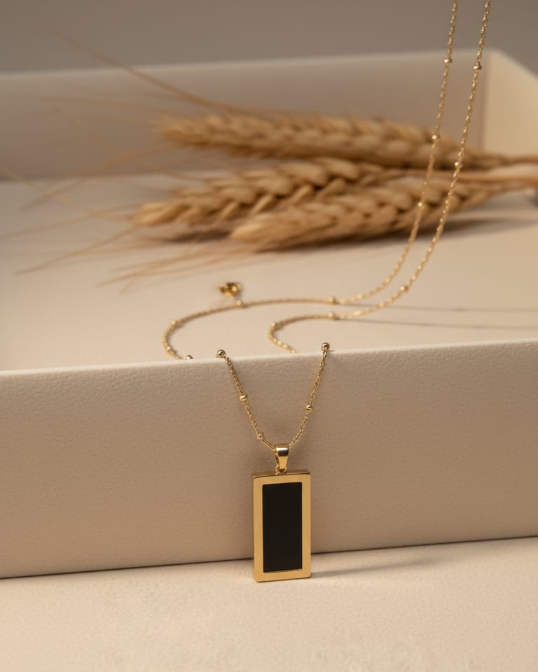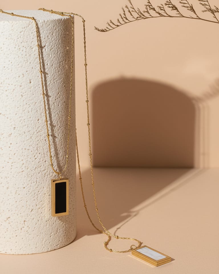 “Two in one elegant golden rectangular pendants, one with a black inlay and the other with a white mother-of-pearl inlay, hang side by side, casting subtle shadows.”