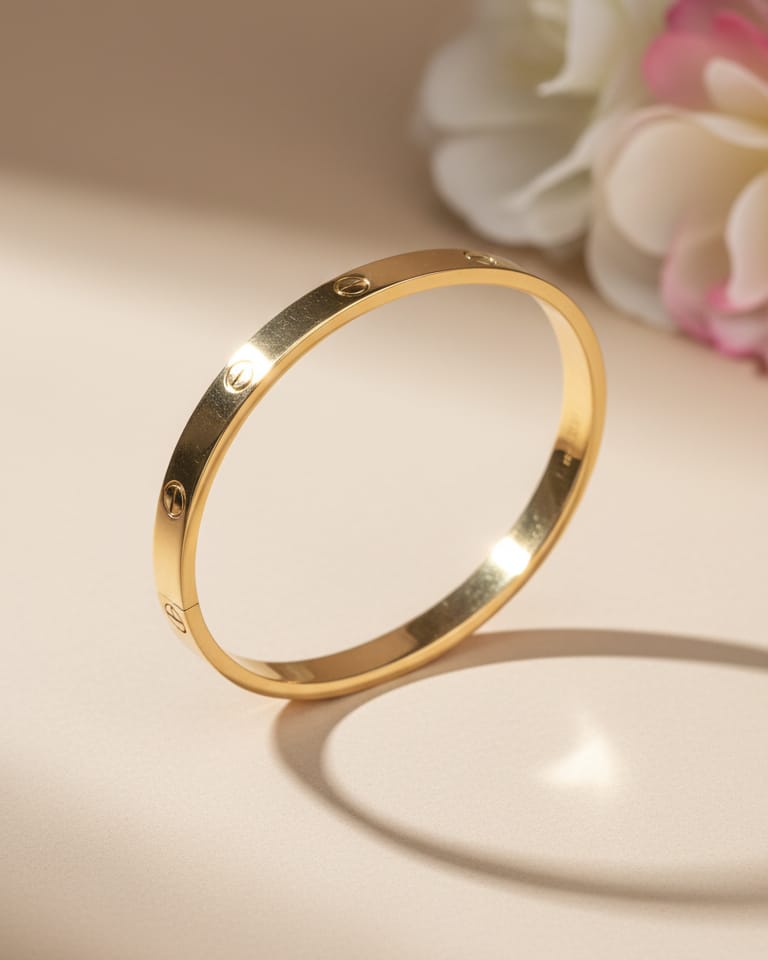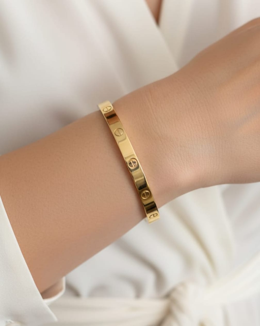 Elegant gold bangle with screw detailing, perfect for a touch of luxury.