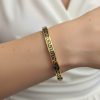A thin, gold-tone bangle bracelet adorned with three delicate butterfly accents, some featuring black enamel and one with a subtle sparkle, secured with a central clasp.