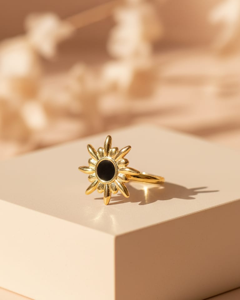 A unique golden ring featuring a radiant sunburst design with a striking black circular center.