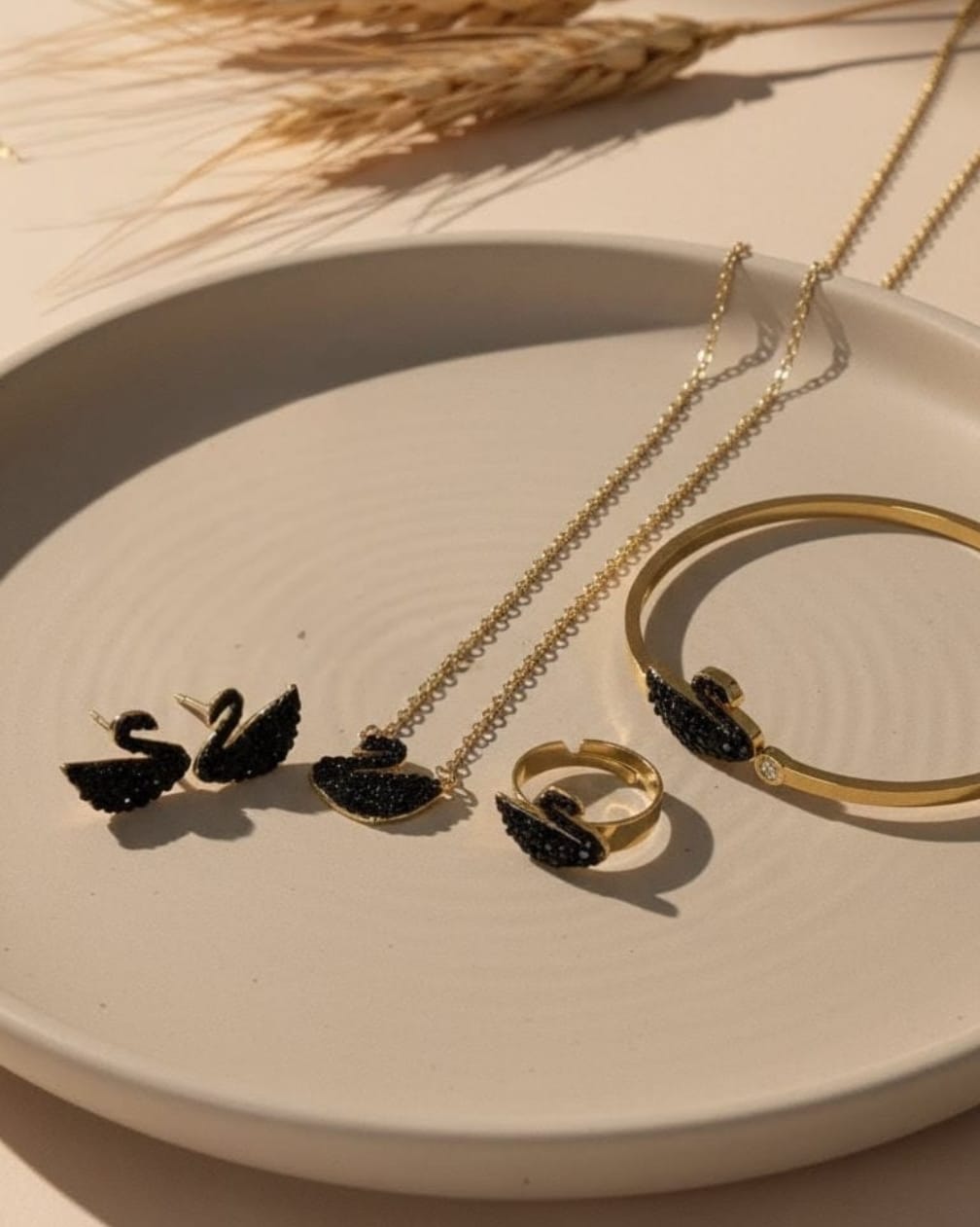 Elegant gold-plated jewelry set featuring black swan designs, including earrings, a necklace, a ring, and a bangle, displayed on a neutral plate with wheat stalks.