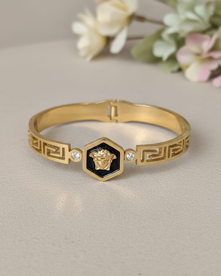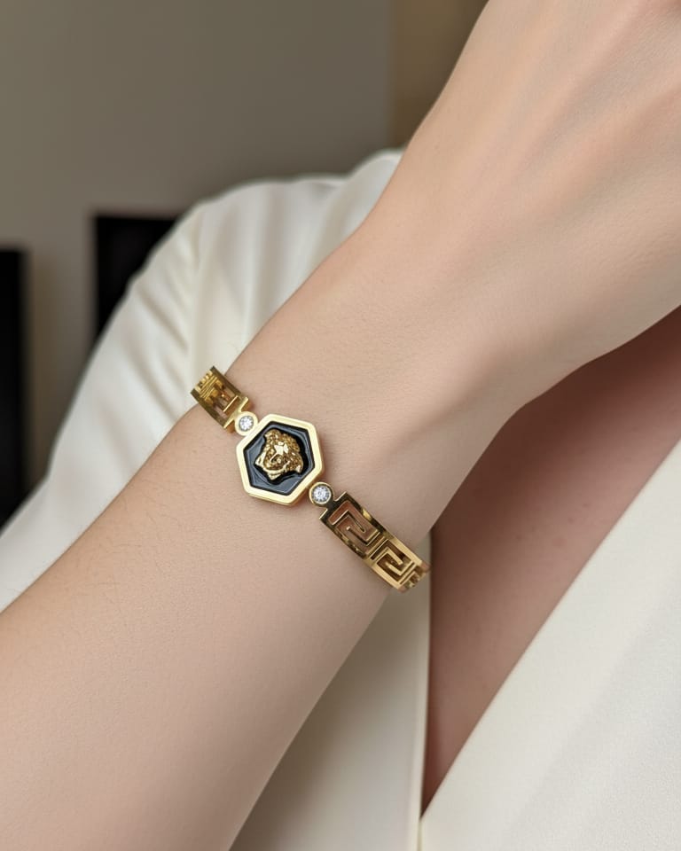 Ornate gold bracelet featuring a striking Versace head and geometric links.