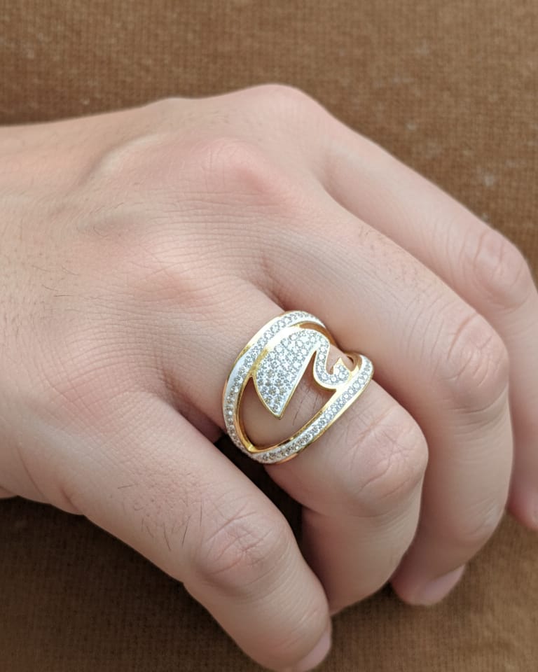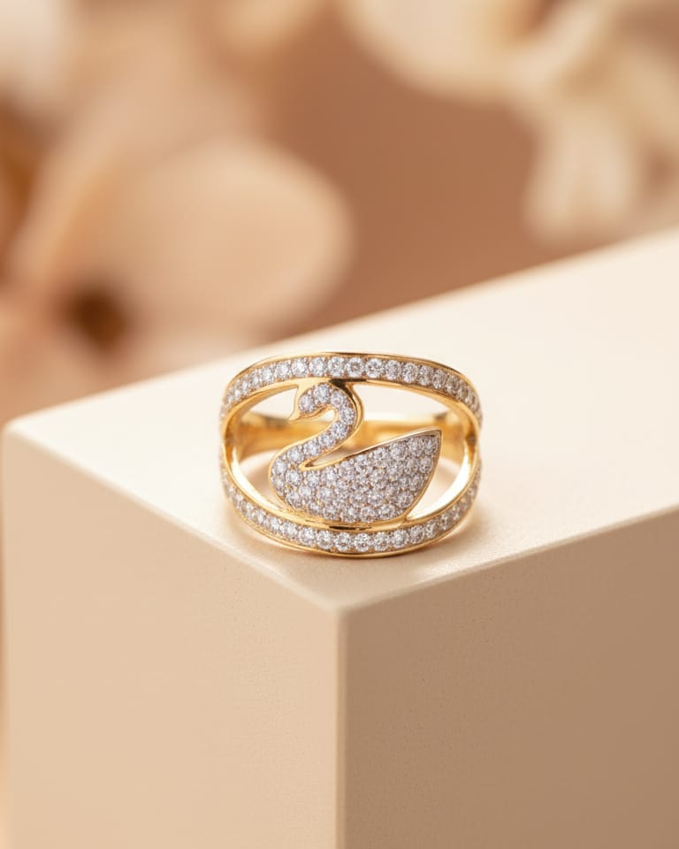 A wide gold-tone cocktail ring featuring an ornate, flowing design with a swan or bird motif in the center, heavily encrusted with pavé-set white stones (likely diamonds or cubic zirconia